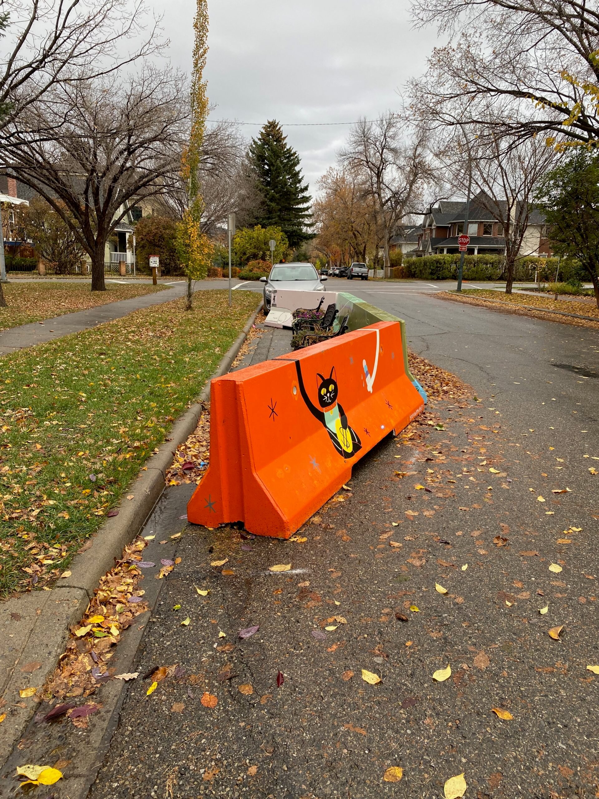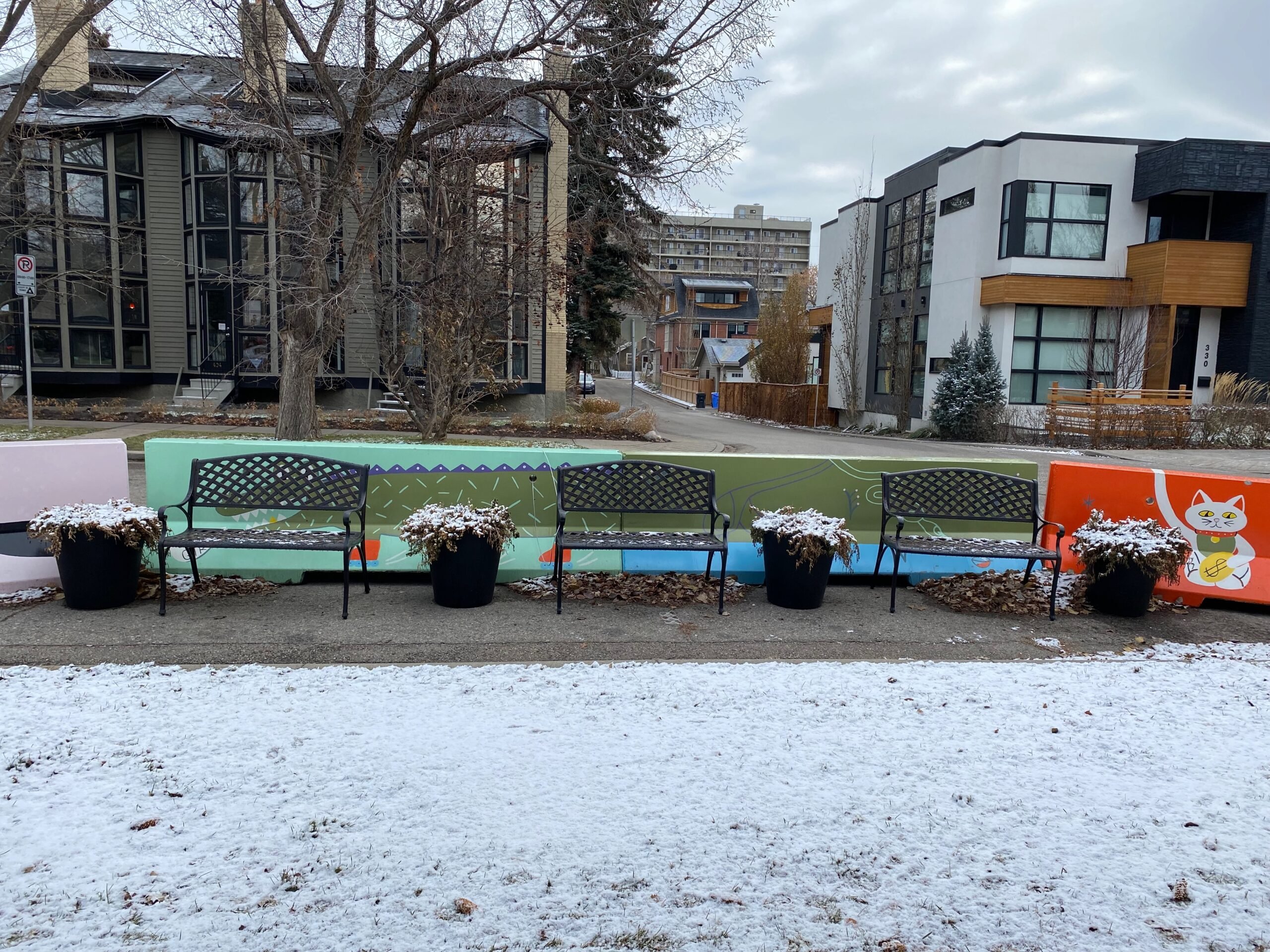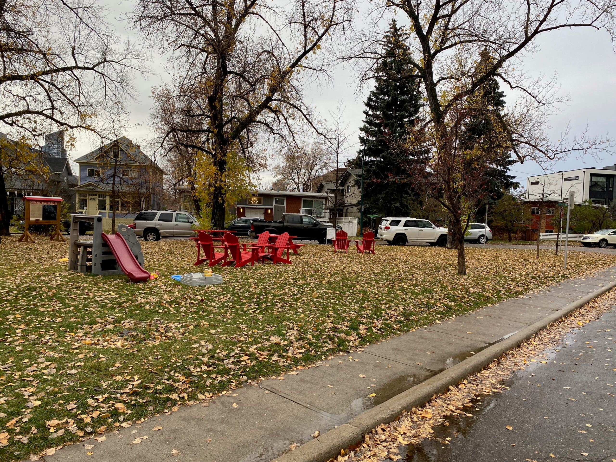 Originally, the project aimed to install traffic calming equipment, but when the City of Calgary provided the necessary barriers at no cost, the community redirected the extra funds to enhance two triangular parks on Gladstone Road. The neighbourhood was able to set up a giant chess board and other games, seating, a fireplace, planters, and more.